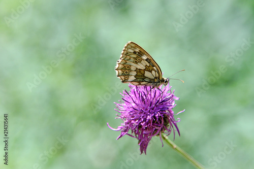 © Linda, Naklejka premium extreme closeup of marbled white butterfly Melanargia galathea on a pink knapweed flower (Centaurea jacea); macro photography with blurred green background, wildlife
