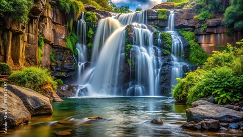 © Prasert, Obraz premium Extreme closeup of waterfall amidst rocky shore and lush vegetation