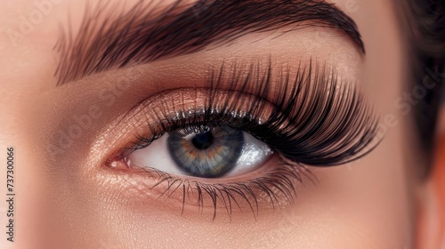 Obraz premium Extreme Long False Eyelashes Transforming a Female Eye. Close-up Macro Shot of Eyelash Extensions, Representing Makeup, Cosmetics, and Beauty