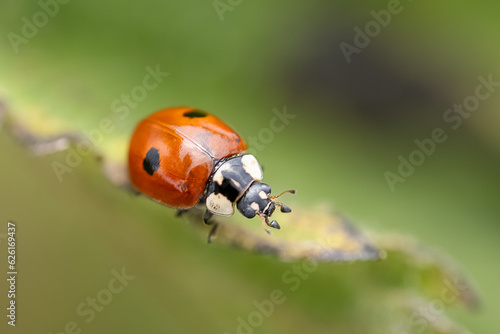 © Cliff, Fototapeta premium Extreme Macro close portrait of a black spot lady bug on a green leaf