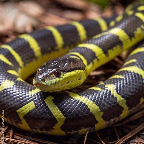 Obraz premium extreme macro shot of a snake coiled body, with a single scale in sharp focus, while the surrounding coils and the background gradually fade into a soft blur, emphasizing the snake's intricate form