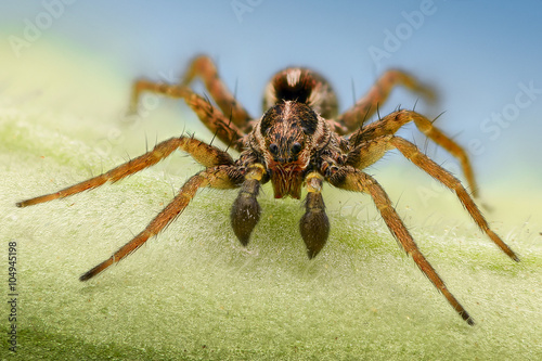 Obraz premium Extreme magnification - Spider on a leaf, front view