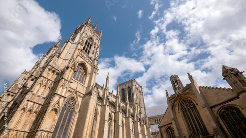 Fototapeta premium Extreme wide angle looking up at York Minster in sunshine - Room for copy
