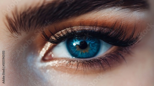 Obraz premium Extremely long false eyelashes on a female eye. Extensions for eyelashes. Beauty, cosmetics, and makeup. Macro, up close.