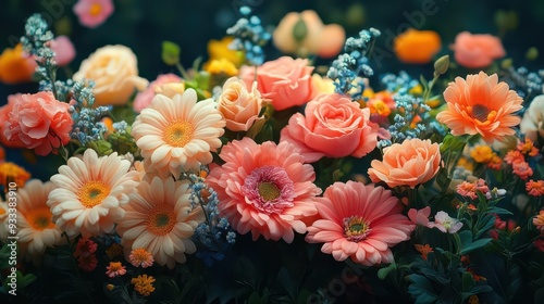 Naklejka premium exuberant floral arrangement explosion of colorful spring blooms delicate petals lush greenery soft focus pastel palette feminine aesthetic
