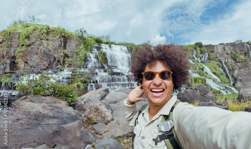 © victor cuenca lopez, Naklejka premium exultant traveler takes selfie with waterfall in the background