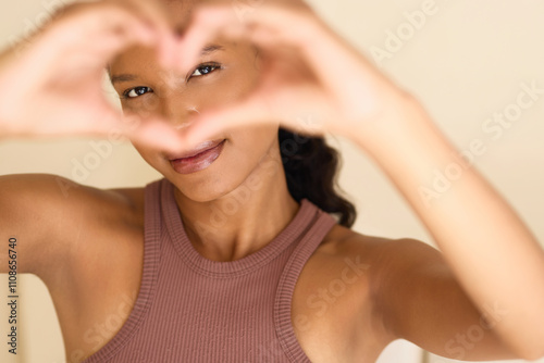 Naklejka premium Eye Care Love: A Woman Smiling Joyfully Through Heart-Shaped Hands. Represents Connection, Affection, and Self-Love. Warm Tones Create a Sense of Happiness and Serenity.