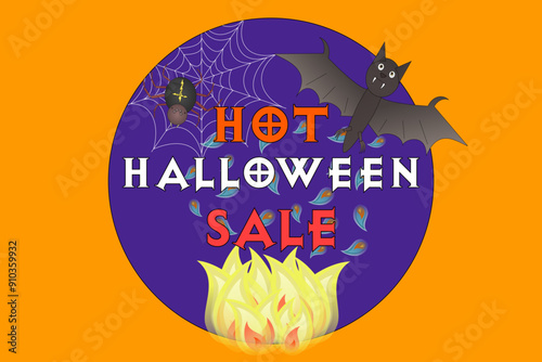 © Alice_Fame, Naklejka premium Eye-catching Halloween sale design featuring a bat, spider, and fire. Ideal for spooky promotional banners and advertisements.