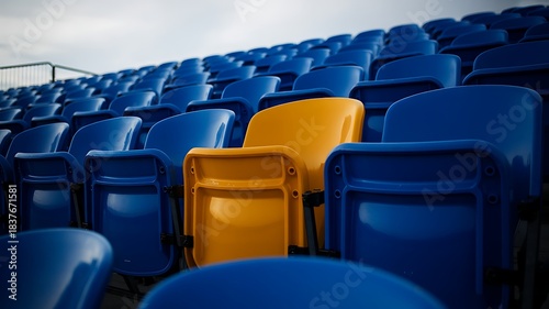 Fototapeta premium Eye-Catching Yellow Chair in a Sea of Blue Stadium Seats Photo