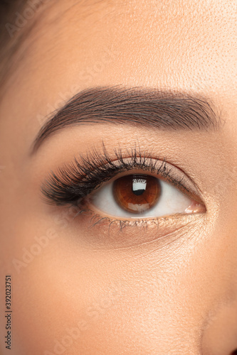 Obraz premium Eye. Close up portrait of beautiful young woman on studio background. Concept of cosmetics, makeup, natural and eco treatment, skin care. Shiny and healthy look, fashion, healthcare. Details.