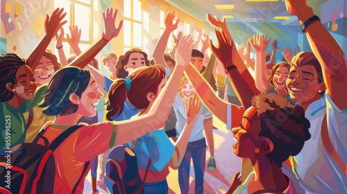 © Vichit Barry, Obraz premium Eye-level angle shot of diverse students high-fiving each other