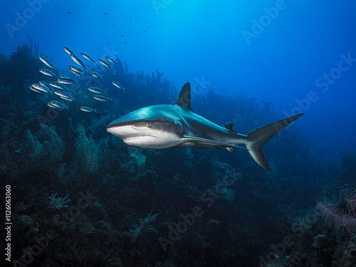 Fototapeta premium Eye level with a Caribbean Reef Shark (Carcharhinus perezii). Coral garden below and a shoal of silversides in front.