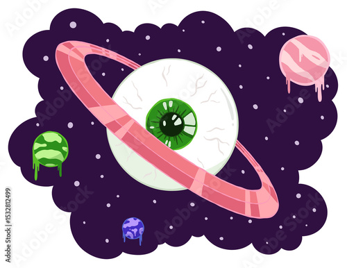 Naklejka premium Eyeball planet is floating in flat design with pink ring, dripping orbs on...