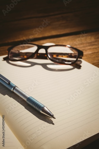 © vectorfusionart, Naklejka premium Eyeglasses and pen on book at home