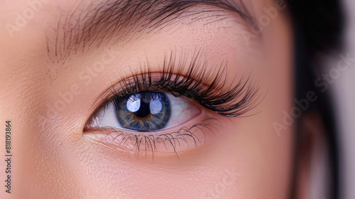 Obraz premium Eyelash extension procedure. Beautiful female asian eyes with long lashes...