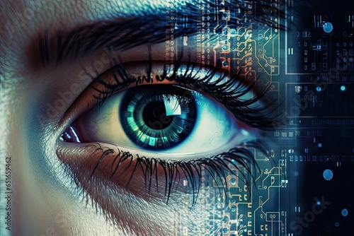 Fototapeta premium Eyes of tomorrow. Exploring futuristic biometric identification. Future of security. Biometric eye scanning in action. Biometric iris identification technology