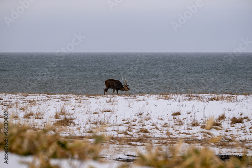 © warapin, Fototapeta premium 冬の海辺に佇むエゾシカ / Ezo Deer Standing by the Winter Seaside
