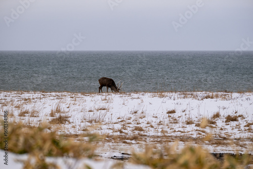 © warapin, Fototapeta premium 冬の海辺に佇むエゾシカ / Ezo Deer Standing by the Winter Seaside