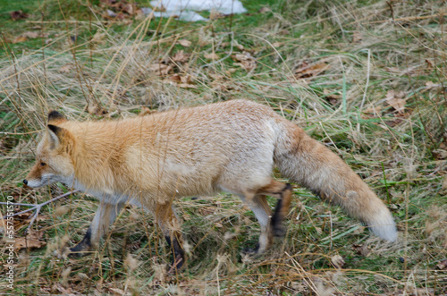 Obraz premium Ezo red fox Vulpes vulpes schrenckii walking. Utoro. Shiretoko Peninsula. Hokkaido. Japan.