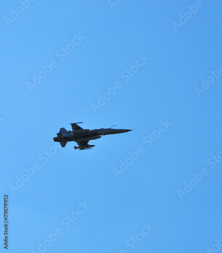 © Myrarte, Fototapeta premium F-16 fighter Falcon flying through the blue sky