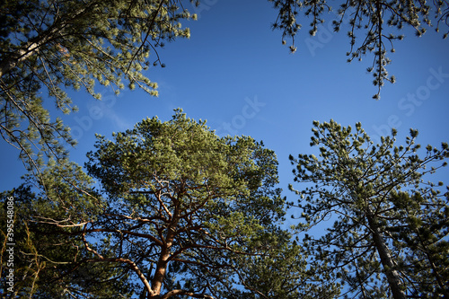 Obraz premium Föhren von unten, Blick in den Himmel mit Nadelbäumen
