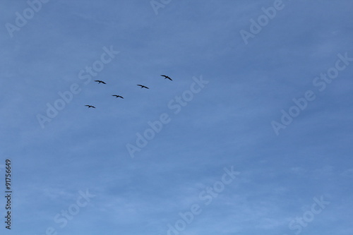 © mg photo, Obraz premium Fünf Pelikane fliegen am Himmel