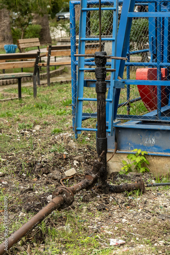 Fototapeta premium Förderstelle mit Rohren im Park von Kuçovë, Kuçovë, Bezirk Berat, Albanien
