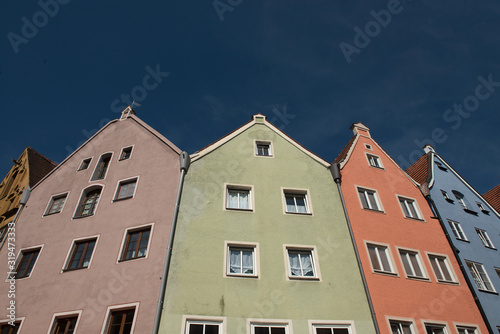 Fototapeta premium Füssen, Germany - July 20, 2019; Colorful historic houses in Füssen a touristic and historic town on the romantic road