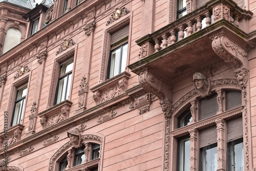 Obraz premium Façade murale rouge décorée style architecture renaissance à Heidelberg, en...