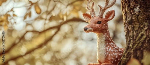 Obraz premium Fabric deer toy perched on a tree branch surrounded by autumn leaves with space for text or creative designs.