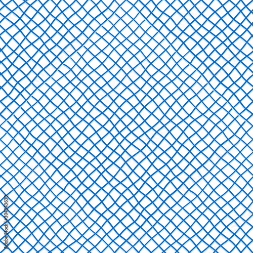 © nadiinko, Fototapeta premium Fabric seamless pattern with textile mesh texture, blue on white background. Simple wallpaper doodle grid, grunge canvas backdrop, monochrome design element