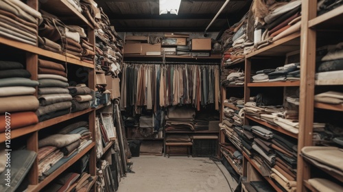 Obraz premium Fabric warehouse storage; textiles, clothing, workshop