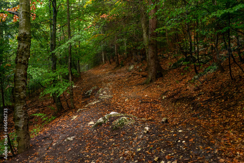 Fototapeta premium Fabulous and mysterious path in the decidous beech foggy forest. Location...
