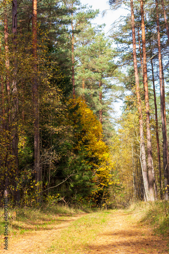 © Evija, Obraz premium Fabulous forest road on a sunny autumn day