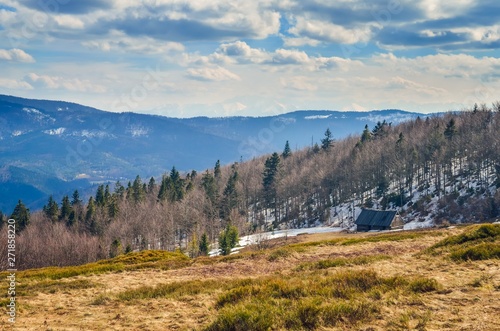 Fototapeta premium Fabulous spring mountain landscape. Wooden cabin on a clearing on a hill.
