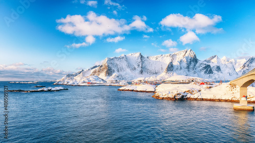Naklejka premium Fabulous winter view of Reine and Sakrisoya villages seen from Hamnoy and...