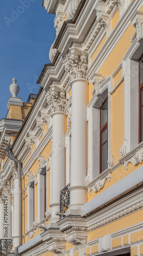 Fototapeta premium Facade fragment of an old mansion in an eclectic style with rich stucco moldings and columns. An elegant architectural background for the concept of luxury, culture, and history.