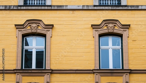Obraz premium Facade of a bright yellow brick structure featuring symmetrical vintage windows and decorative stucco.