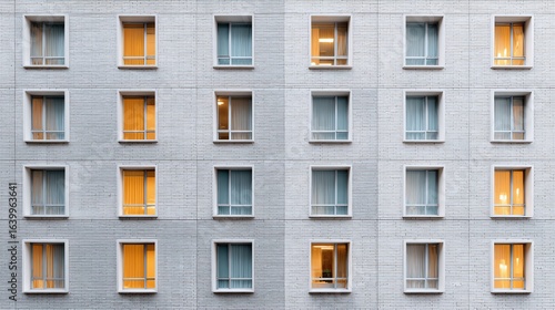© Oleksandr, Fototapeta premium Facade of a building with a series of windows, some illuminated from within, creating a grid-like pattern on a light-colored brick wall.