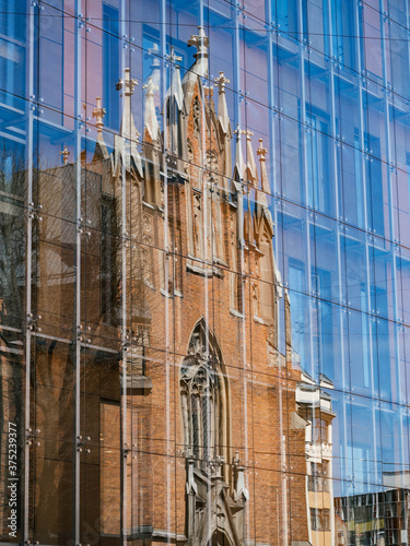 © Jānis Beitiņš, Naklejka premium Facade of a church reflecting on glass wall