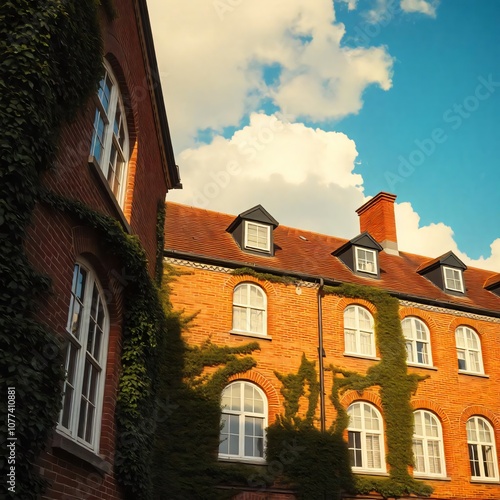 Fototapeta premium Facade of a historic brick building with arched windows and a balcony...