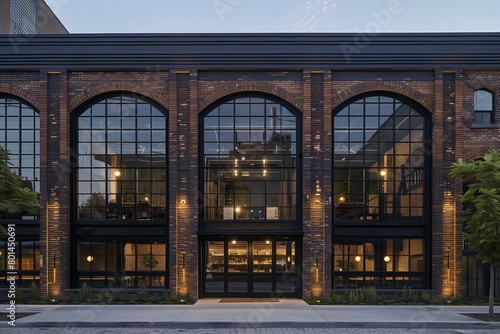 © Anastasiia Trembach, Obraz premium Facade of a modern building with large windows in the evening