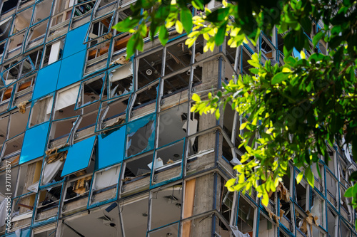 © Erich, Fototapeta premium facade of an office building damaged by the impact of an explosion