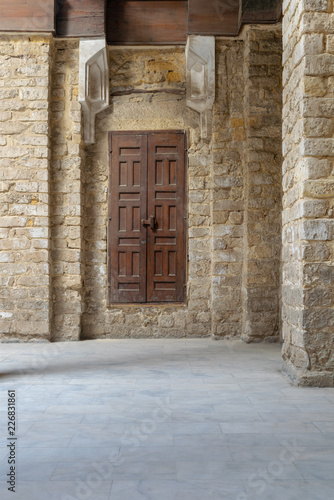 © Khaled El-Adawi, Fototapeta premium Facade of old abandoned stone bricks wall with grunge weathered wooden door, Old Cairo, Egypt