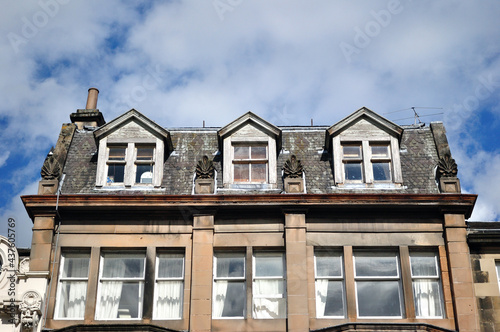 © eyepals, Fototapeta premium Facade of Old Stone Building with Dormer Windows seen from below