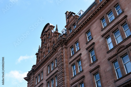 © eyepals, Fototapeta premium Facade of Old Stone Victorian Building against Blue Sky