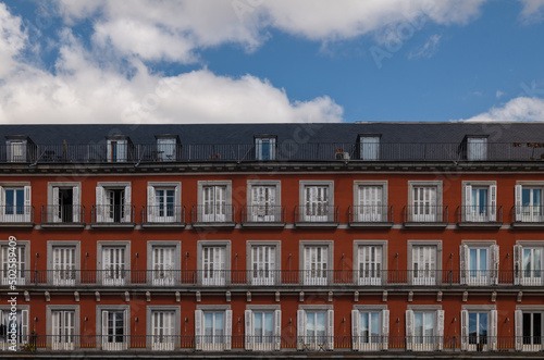 © WeeKwong, Fototapeta premium Facade of red building with balconies against cloudy sky. Madrid, Spain