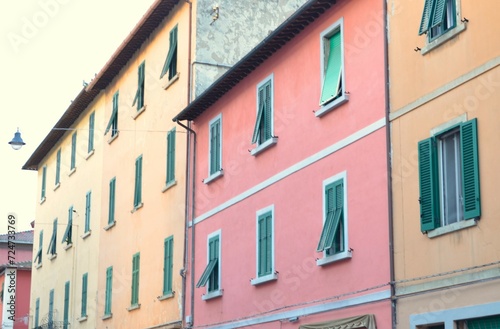 © Valerii, Fototapeta premium Facades of houses of different colors with windows.