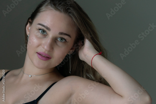 Fototapeta premium Face close up image of young white woman wearing black underwears.