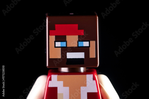 © Klochkov, Naklejka premium Face closeup of LEGO Minecraft man pirate on the black background